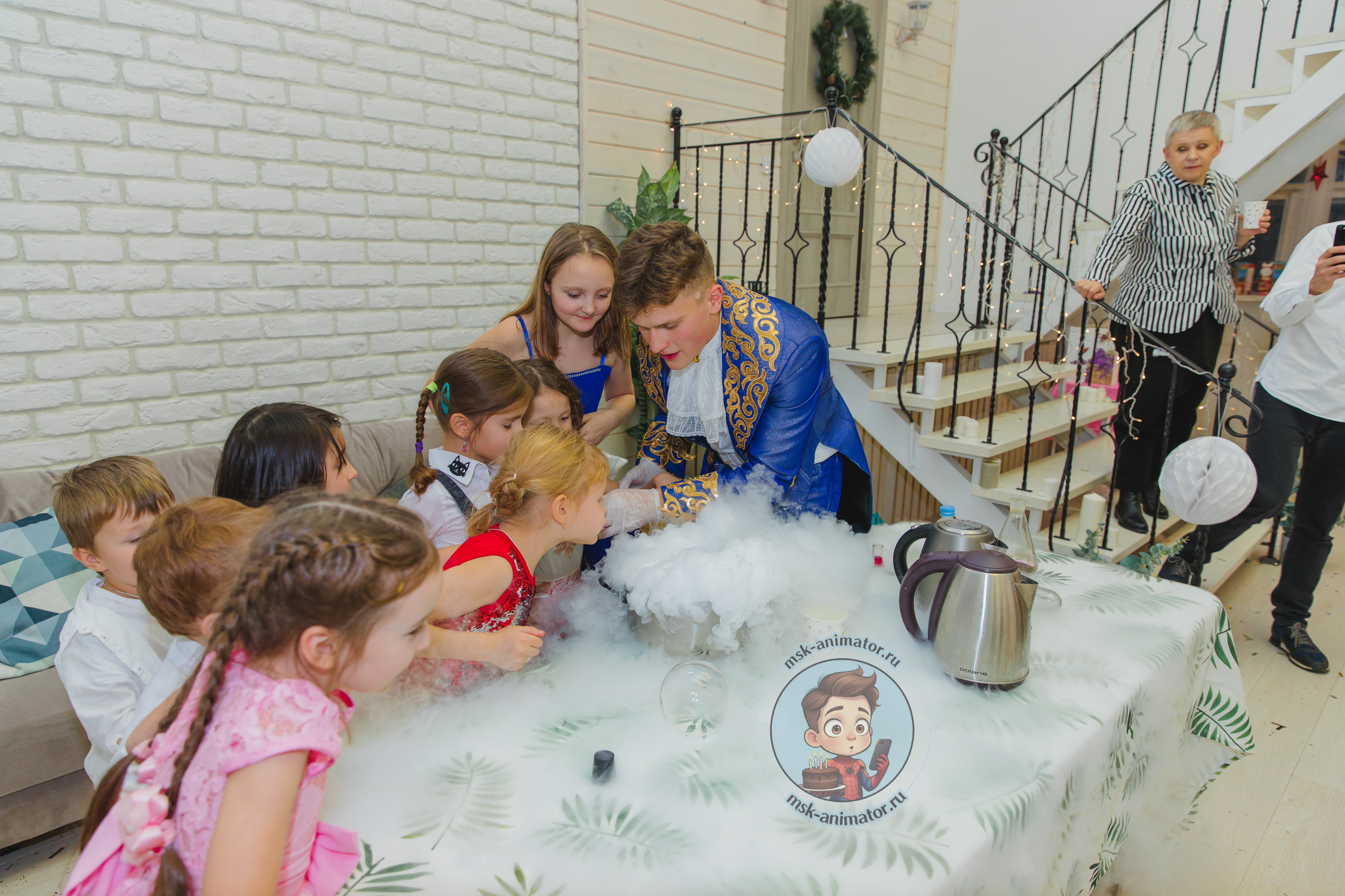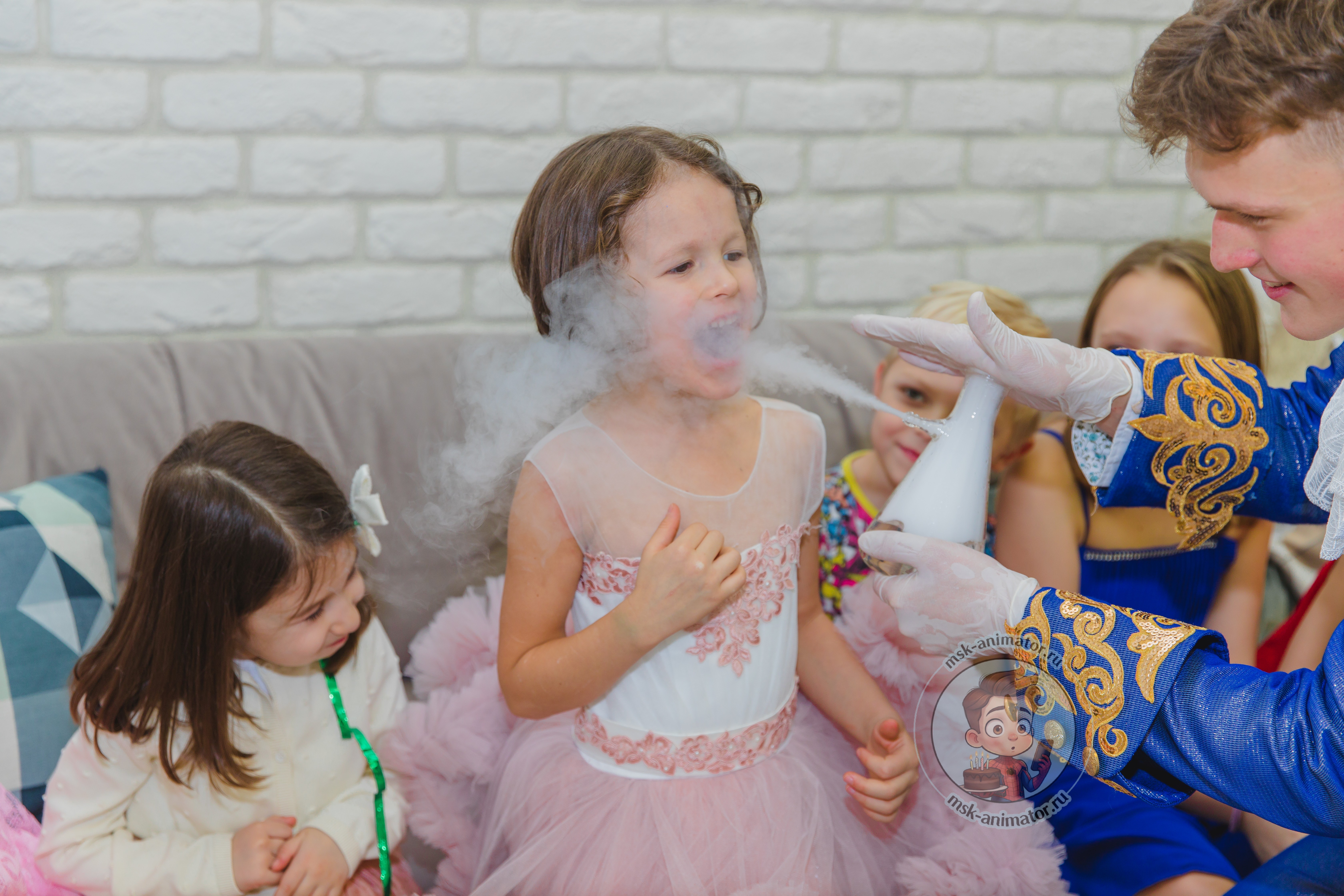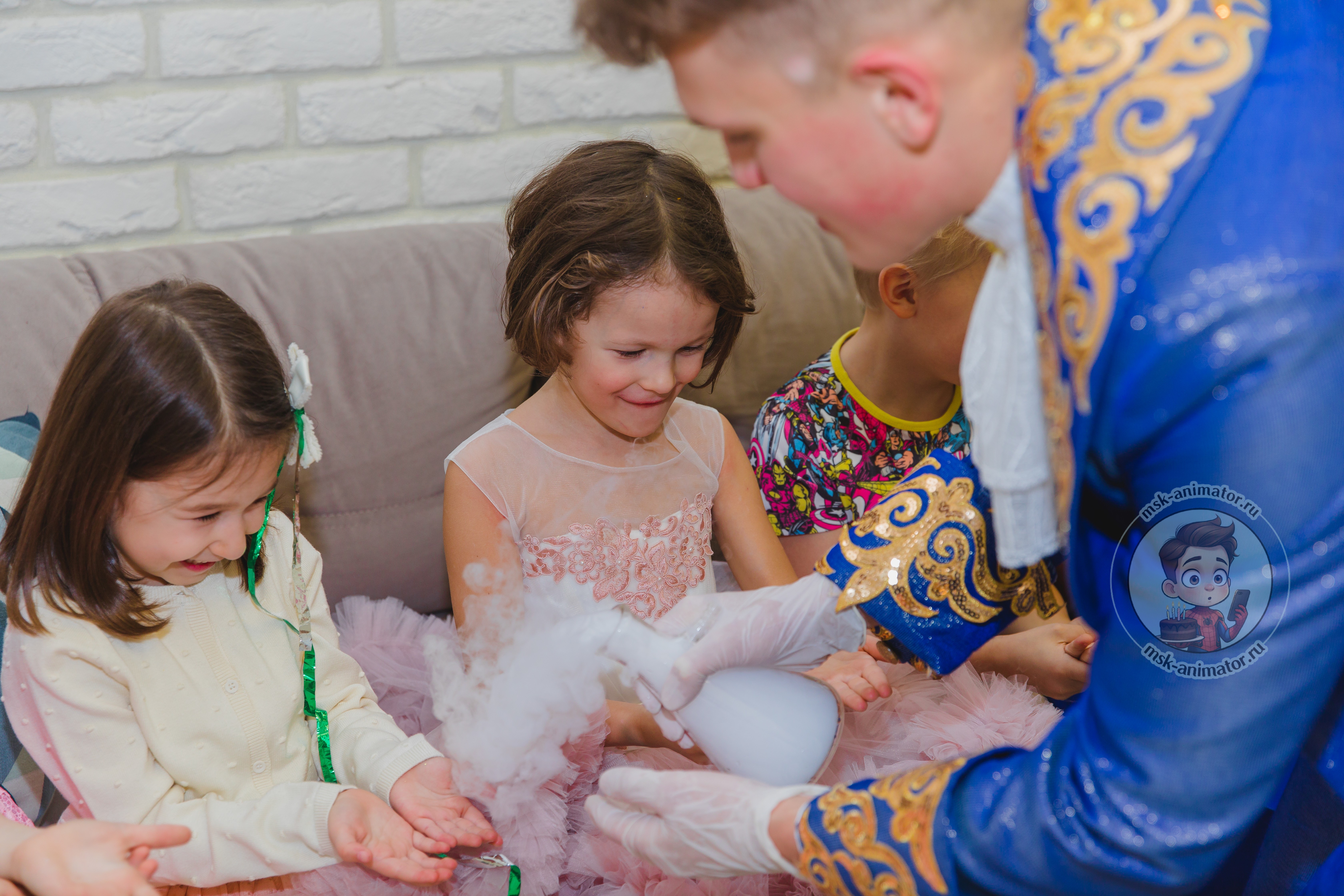 Дети в восторге визжат от зрелищных опытов с сухим льдом. Ведущий демонстрирует огромные дымные пузыри, кипящие колбы и туман, ползущий по полу. Каждый ребёнок может создать своё дымное облако и поймать пузырь с паром. Это красиво, безопасно и создаёт особую атмосферу.